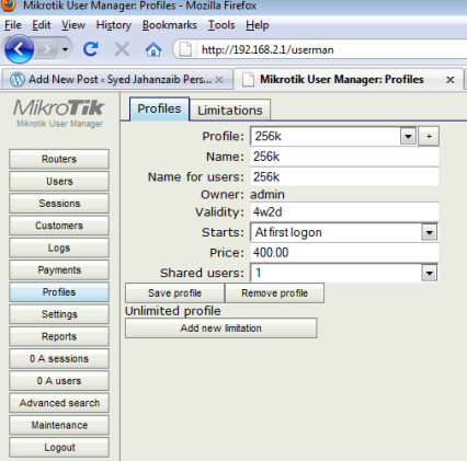 لأغراض الاختبار ، سنقوم بإضافة ملف تعريف واحد بسرعة 256 كيلوبت في الثانية ، والحد الأقصى لمدة 30 يومًا. يمكنك إضافة العديد من الحزم وفقًا لمتطلباتك لاحقًا ، بمجرد أن تفهم كيفية عمل ذلك )