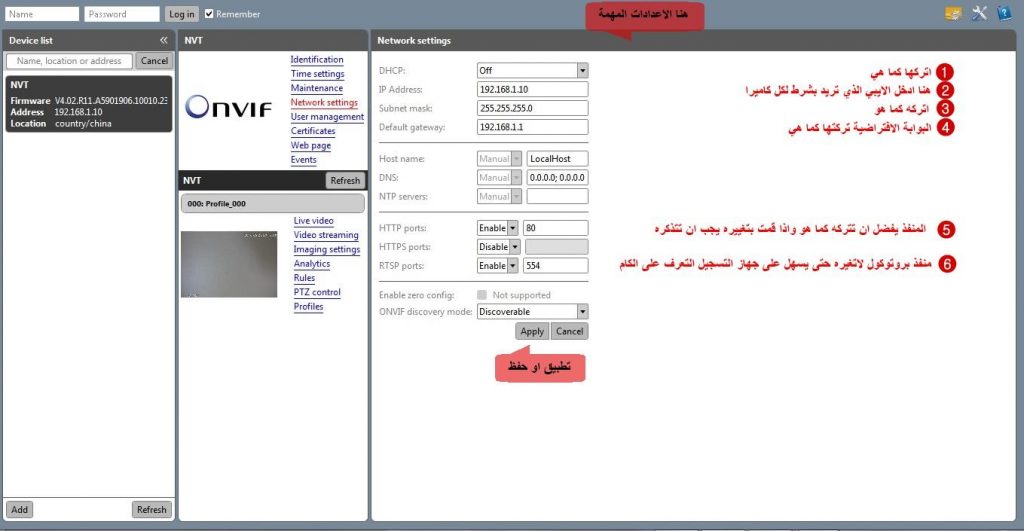طبعا يجب أن تثبت ايبي الكمبيوتر لنضعه فرضا 192.168.1.5 أو أي ايبي لايتعارض مع الأجهزة لديك وفتحت برنامج ONVIF DEVICE MANAGER وسويت بحث طلعت الكاميرا من هذا البرنامج تستطيع تغيير كلمة السر وال IP الكاميرا والبورت وجميع الاعدادات