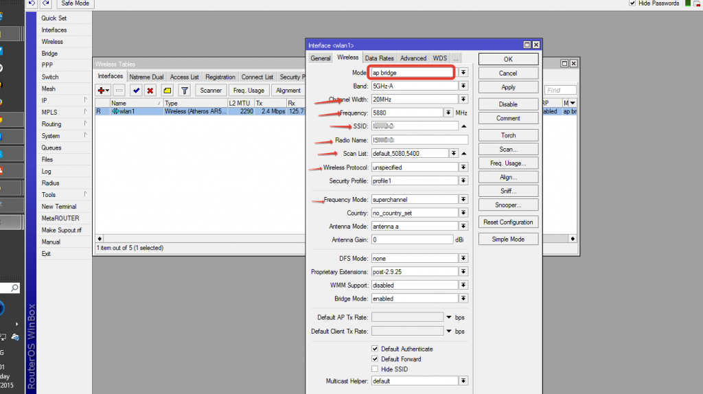 باستخدام راديو Mikrotik 5Gh مع هوائي Omini-direction ، قم بإعداد نقطة وصول في أحد المكاتب. سيتم إدخال التكوين التالي على نقطة الوصول (AP)