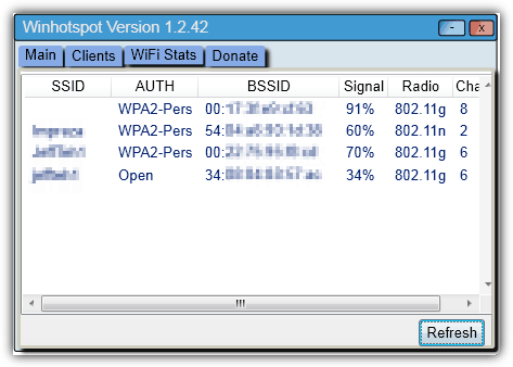 Winhotspot هو في الواقع تطبيق قائم بذاته يتيح لك بسهولة إنشاء نقطة فعالة لمشاركة اتصالك بالإنترنت. ومع ذلك ، فإنه يأتي أيضا بفاحص للشبكات ،يمكنك الوصول إليه من علامة تبويب WiFi Stats والنقر فوق”تحديث”حيث يعرض جميع الشبكات اللاسلكية المتاحة بما في ذلك الشبكات المخفية.