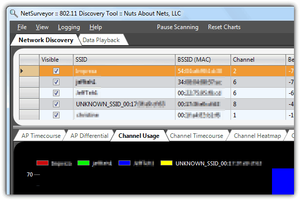 معظمهم يعرضSSIDفارغا بينما يعرضNetSurveyorفقطUNKNOWN_SSID.وهناك بعض الأدوات المساعدة الآخرى.