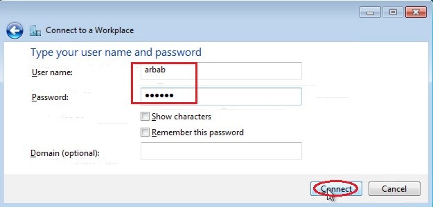 اكتب التالي اسم مستخدم / كلمة مرور VPN وبعد ذلك انقر على اتصال: