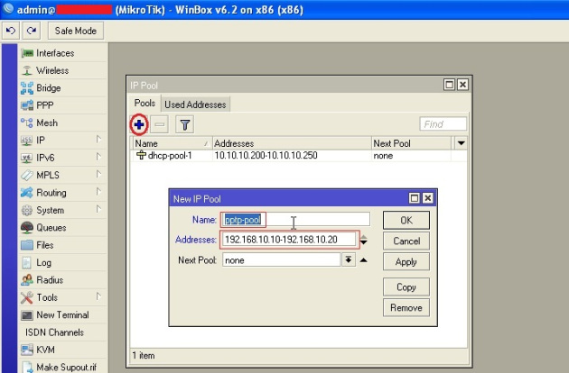 انقر فوق “+” لإضافة pool جديد ، قم بتسميتة أي شيء تريده (مثل تسميته pptp-pool) ، أضف range العنوان (192.168.10.10-192.168.10.20 ، في حالتي) ، ثم اضغط OK: