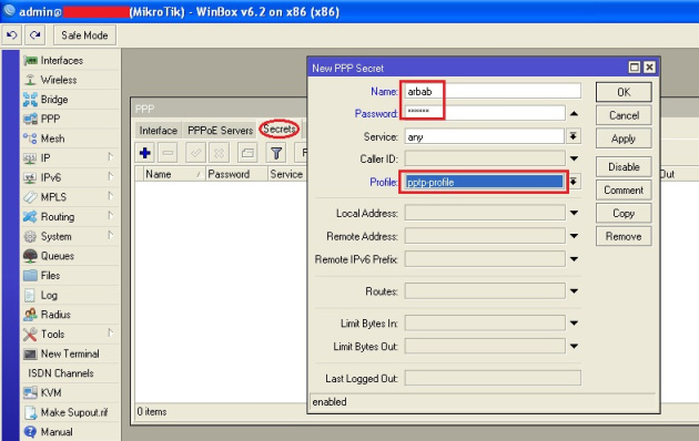 تحقق من سجلات pptp على Mikrotik عن طريق تسجيل الدخول: