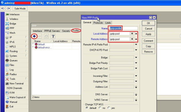 انقر فوق علامة الجمع لإنشاء ملف تعريف جديد ، قم بتسميتة أي شيء تريده (مثل استخدام pptp-profile) ، وقم بتعيين pool الذي أنشأناه سابقًا لـ “Local Address” و “Remote address” ، ثم اضغط على موافق.