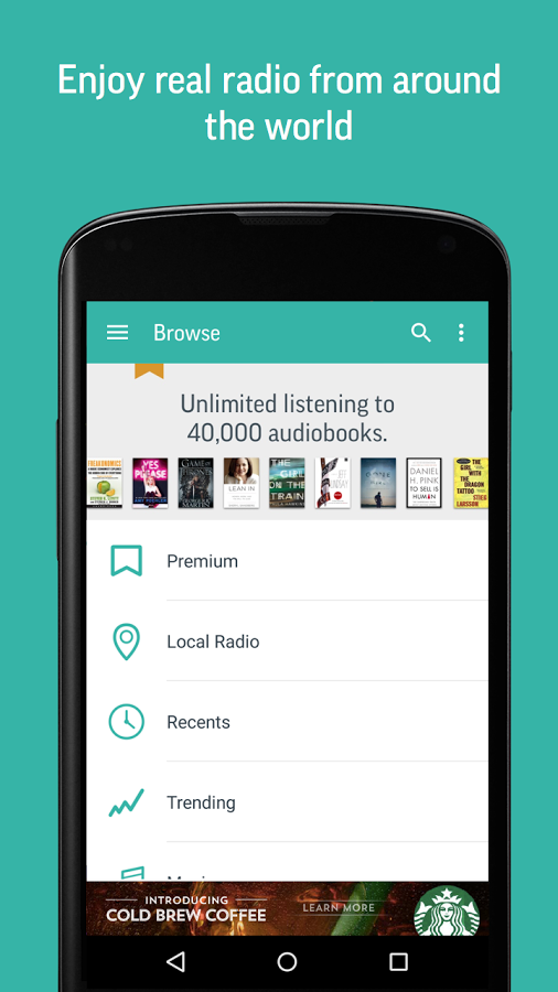 كذلك توجد نسخة مدفوعة من التطبيق تمنحك مكتبة تحتوي على ما يصل إلى 40000 كتاب صوتي و 600 محطة موسيقية تجارية.