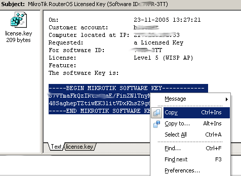 ابحث عن البريد الإلكتروني من mikrotik الذي يحتوي على مفتاحك