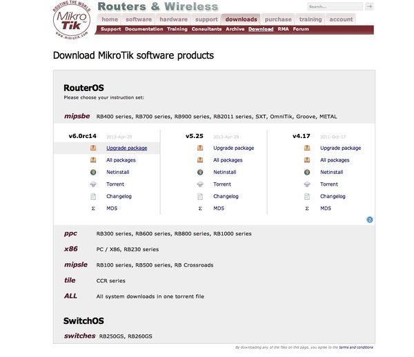 الخطوة الأولى – قم بزيارة www.mikrotik.com وتوجه إلى صفحة التنزيل ، اختر نوع النظام الذي قمت بتثبيت RouterOS عليه.