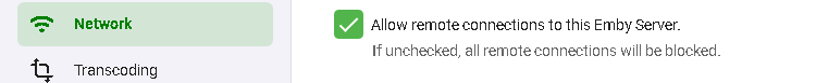 يمكنك القيام بذلك من قائمة شبكة الخادم عن طريق تمكين “Allow remote connections to this Emby Server”.