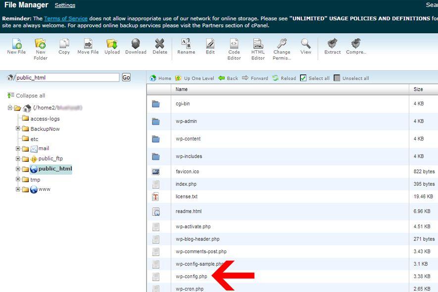 من خلال إدارة الملفات “File Manager” في cPanel سنقوم بتعديل الملف wp-config.php الموجود بالمجلد الرئيسي :