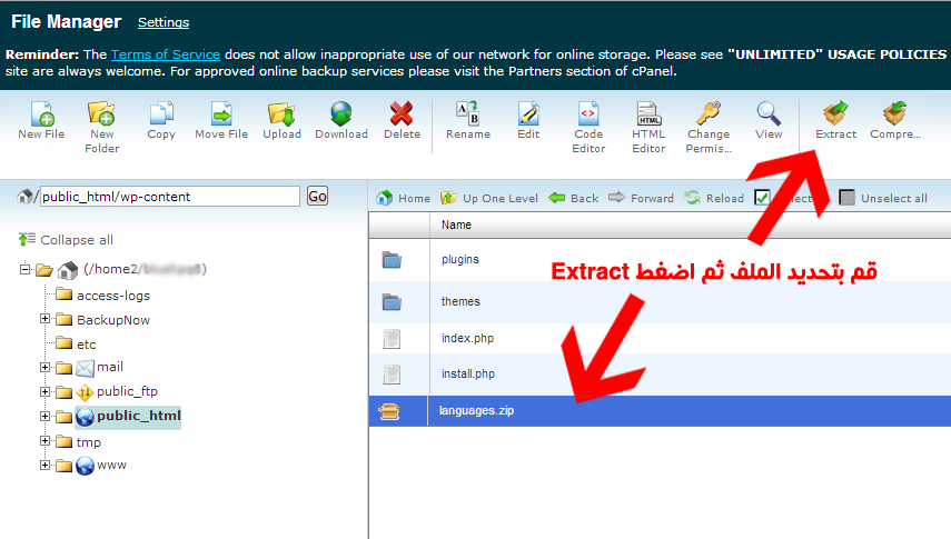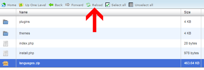 بعد أن تم رفع الملف بنجاح , قم بإغلاق النافذة ثم قم بالعودة إلى صفحة التحكم بالملفات و ستجد أن الملف تم رفعه إلى المجلد (إذا لم يظهر لديك الملف , اضغط Reload أو إعادة تحميل) … بعد ذلك , قم بفك الضغط عن الملف كما في الصور التالية :