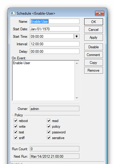 /system scheduler add comment=”” disabled=no interval=12h name=Disable-User on-event=Disable-User policy=reboot,read,write,policy,test,password,sniff,sensitive start-date=jan/01/1970 start-time=\ 22:00:00 add comment=”” disabled=no interval=12h name=Enable-User on-event=Enable-User policy=reboot,read,write,policy,test,password,sniff,sensitive start-date=jan/01/1970 start-time=\ 09:00:00 add comment=”” disabled=no interval=12h name=Remove-Acteve on-event=Remove-Acteve policy=reboot,read,write,policy,test,password,sniff,sensitive start-date=jan/01/1970 start-time=\ 22:01:00