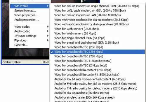 وقبل أن أنهي أحب أن أونوه إلى نقطة مهمة وهي تحديد دقة العرض من خلال معرفة سرعة كبل الشبكة وهو يتم من خلال Device>WMV وأختيار الدقة المناسبة وأنا أفضل دائما أختيار 384 Kbps أو 768 Kbps :