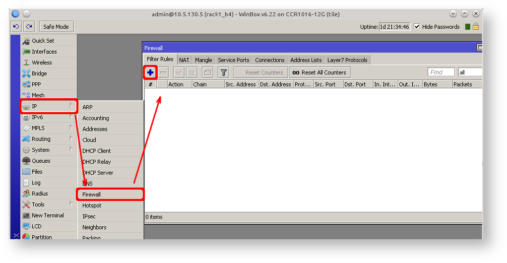 يجب أن يكون اتصال IP على الواجهة العامة محدودًا في جدار الحماية. لن نقبل سوى وصول ICMP (ping / traceroute) و IP Winbox و ssh.