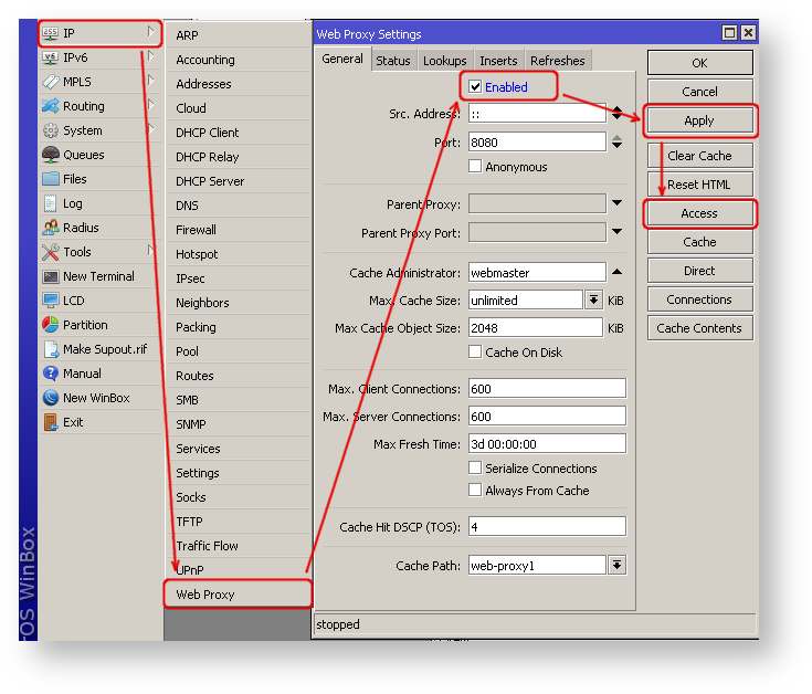 أولاً ، نحتاج إلى إضافة قاعدة NAT لإعادة توجيه HTTP إلى وكيلنا. سنستخدم خادم وكيل RouterOS مدمج يعمل على المنفذ 8080.