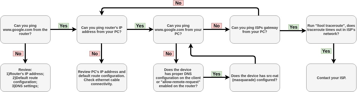 يحتوي RouterOS على العديد من أدوات استكشاف الأخطاء وإصلاحها المضمنة ، مثل ping و traceroute و torch و packet sniffer واختبار النطاق الترددي وما إلى ذلك.