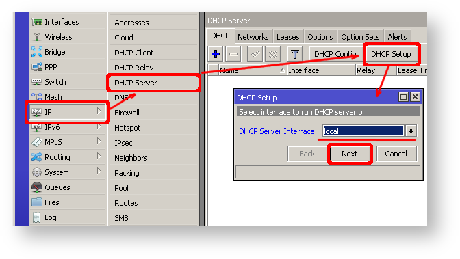 انقر فوق الزر إعداد DHCP ، سيتم فتح مربع حوار جديد ، أدخل واجهة خادم DHCP المحلية وانقر فوق الزر التالي ؛