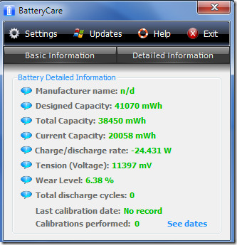 - يقدم برنامج BatteryCare معلومات مفصلة حول البطارية من حيث التآكل والإستهلاك وكذلك يشير للشركة المصنعة.