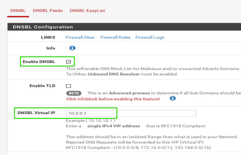 يتطلب مربع الاختيار هذا استخدام محلل UnBound DNS في مربع pfSense لفحص طلبات DNS من عملاء LAN. لا تقلق تم تكوين UnBound في وقت سابق ولكن هذا المربع بحاجة إلى التحقق! العنصر الآخر الذي يجب ملؤه على هذه الشاشة هو “DNSBL Virtual IP“.