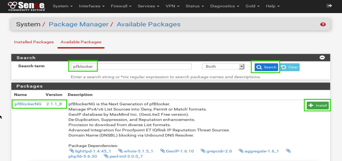 بعد تحميل صفحة “Available Packages” ، اكتب “pfblocker” في مربع “Search term” وانقر على “Search“. يجب أن يكون العنصر الأول الذي تم إرجاعه pfBlockerNG. حدد موقع زر “Install” على يمين وصف pfBlockerNG ثم انقر على “+” لتثبيت الحزمة.