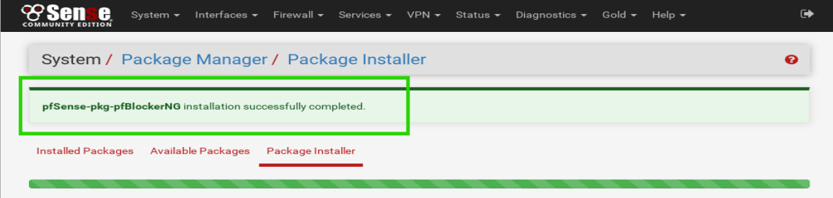 بمجرد التأكيد ، سيبدأ pfSense في تثبيت pfBlockerNG. لا تتجاهل او تغلق او تذهب بعيدا عن صفحة المثبت! انتظر حتى تعرض الصفحة اتمام التثبيت بنجاح.