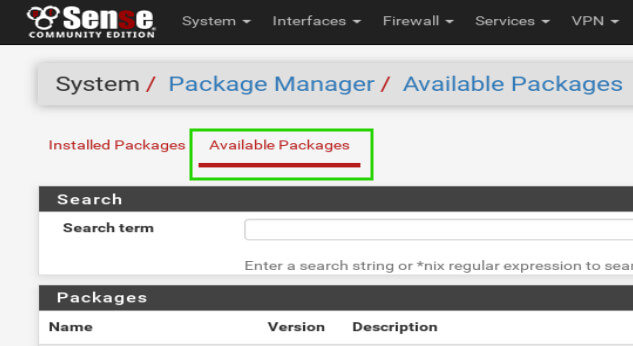انقر فوق النص “Available Packages” ليتم توفير قائمة من الحزم القابلة للتثبيت لـ pfSense.