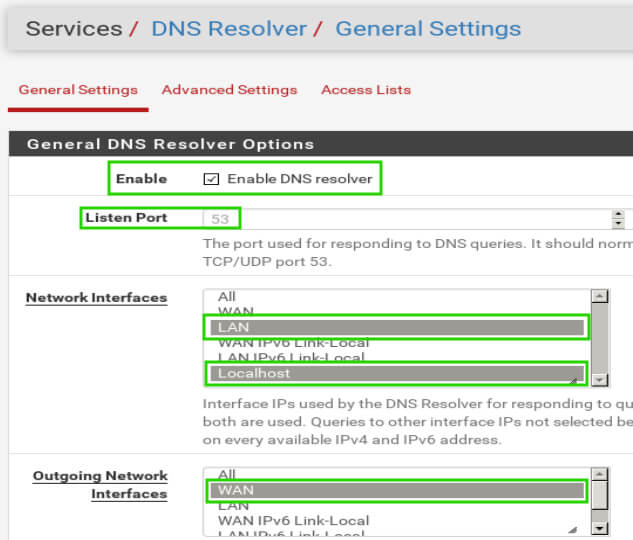الإعدادات التالية هي تعيين منفذ الاستماع لطلبات الـ DNS (عادةً مايكون المنفذ 53) ، وتعيين interfaces الشبكة التي يجب أن يستمع إليها DNS resolver (في هذا التكوين ، يجب أن يكون منفذ LAN و Localhost) ، ثم إعداد منفذ الخروج (يجب يكون WAN).