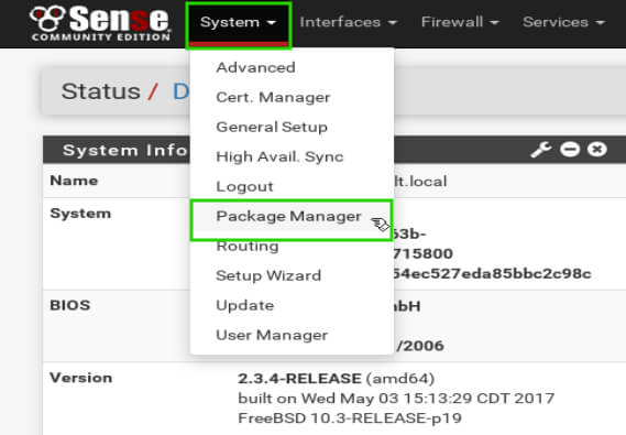 الان بعد تسجيل الدخول إلى صفحة pfSense الرئيسية ، انقر على القائمة المنسدلة “System” ، ثم حدد “Package Manager“.