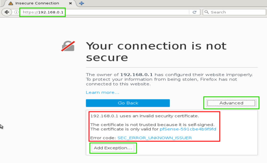 قد تواجة بعض المتصفحات مشكلة مع شهادة SSL ، وهذا أمر طبيعي نظرًا لأن الشهادة موقعة ذاتيًا بواسطة جدار الحماية pfSense.