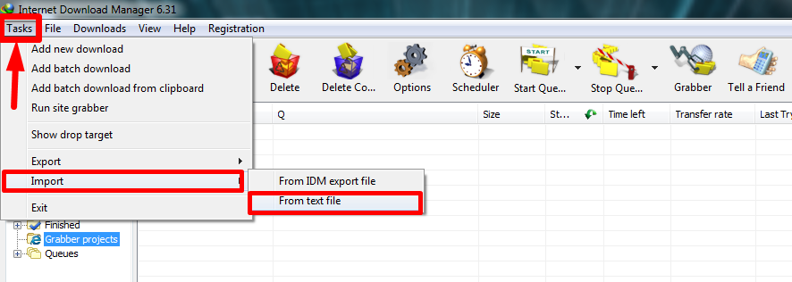 نقوم بفتح انترنت دونلود مانجر ثم الذهاب للقائمه المهام الخاصه به واختيار استراد بروابط من ملف نصي