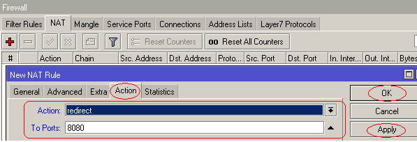 /ip firewall nat add action=redirect chain=dstnat disabled=no dst-port=80 protocol=tcp to-ports=8080