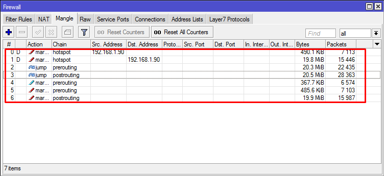 / ip firewall mangle add chain = prerouting action = jump jump-target = hotspot / ip firewall mangle add chain = postrouting action = jump jump-target = hotspot