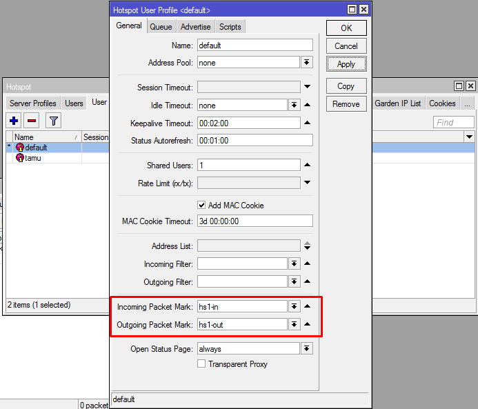 هو طريقة Hotspot Mikrotik Bandwidth Limit باستخدام علامةparameter-packet-mark Incoming وعلامة packets-mark في ملف تعريف المستخدم user-profile . باستخدام HTF Limitation المخصص ، يمكنك تنفيذ القيود بناءً على معايير اتصالات أكثر تنوعًا.