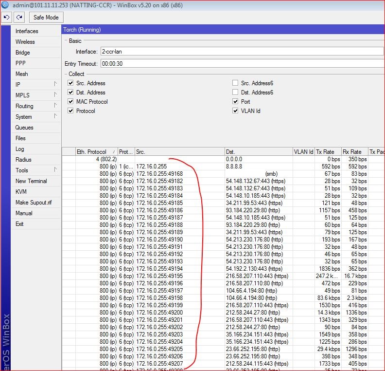 RUN Torch على NATTING Router… كما يمكننا أن نرى أن NATTING الموجه يشاهد مستخدمي pppoe dueto مباشرة في الاتجاه المعاكس.