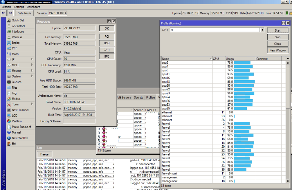 عندما يكون لدينا انقطاع في الشبكة مثل الفشل في أي منطقة معينة للبث ، ففي LOG يمكننا رؤية العديد من جلسات PPPoE مفصولة برسائل “peer not responding“. بالضبط في هذه اللحظات ، يصل استخدام وحدة المعالجة المركزية NAS إلى 100٪ تقريبًا ، مما يؤدي إلى توقف جهاز الميكروتك عن مرور الـ traffic بأي نوع من أنواع الزيارات. وهذا يمكن أن تستمر لمدة دقيقة أو حتى أعلى.
