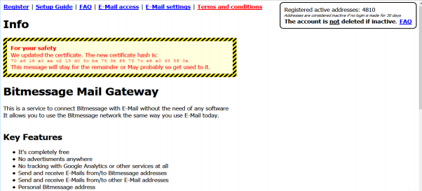 يوفر لك هذا الموقع إمكانية إرسال رسائل Bitmessage مع البريد الإلكتروني بدون أي برامج باستخدام رابط تور فقط وكذلك يمكنك إنشاء عنوان Bitmessage شخصيه بسهولة ويمكنك إرسال أو إستلام رسائل بريد إلكترونيه إلى عناوين البريد المختلفه ويتميز موقع الويب المظلم هذا بأنه يحتوي على الرد التلقائي على الرسائل ويقوم بوضع توقيعين بشكل آلي على جميع الرسائل وجميع الخدمات مجانيه بشكل كامل