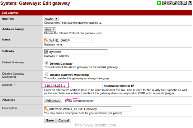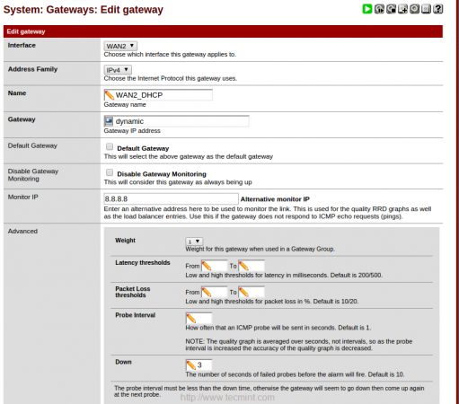 8. في صفحة “Edit gateway” ، أدخل عنوان IP الخاص بمراقبة عنوان IP لكل من WAN1 و WAN2.