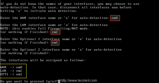 2. اختر الـ interface 1 em0 كما WAN1 ، سيتم تعيين IP من DHCP ، سوف تكون الـ interface الثانية em2 للشبكة المحلية ويمكنك إضافة interface أكثر em01 (اختياري وبحسب رغبتك بذلك) ، سيتم تغيير هذا لاحقا إلى WAN2 مع عنوان IP DHCP. هنا هي الـ interface النهائية المخصصة على النحو التالي :