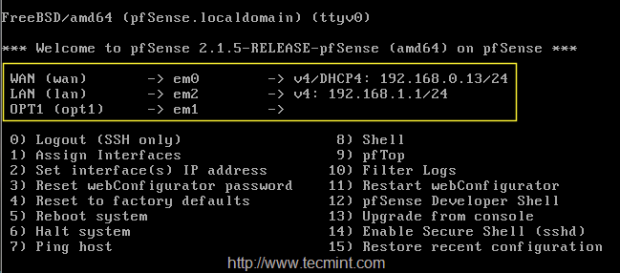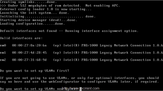1. بعد تثبيت PFSense وتشغيلة ، سوف يتم عرض الشاشة التالية مع واجهات الانترفيس المتاحة لتكوين الشبكة.