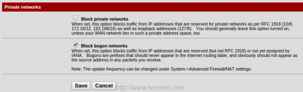 6. من أسفل صفحة WAN2 أسفل الشبكات الخاصة ، قم بإلغاء تحديد شبكات Block Private لإلغاء حظر حركة المرور من الشبكات المحلية ، وحظر شبكات bogon. احفظ التغييرات بالنقر فوق حفظ.
