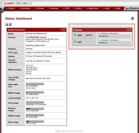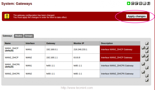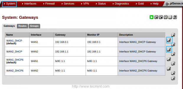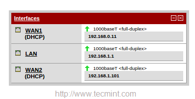 في هذا الإعداد ، سنرى كيفية إعداد ميزة “تجاوز الفشل وموازنة التحميل” لتمكين PFSense من تحميل حركة الرصيد من شبكة LAN الخاصة بك إلى شبكات WAN متعددة (هنا سنستخدم اتصالين WAN ، WAN1 و WAN2).