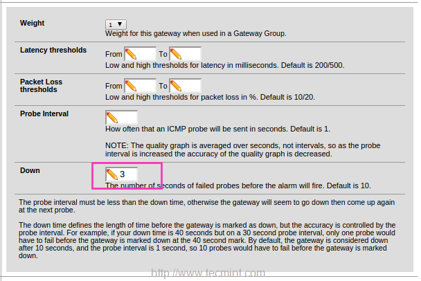 9. بعد إضافة IP للمراقبة ، انقر فوق خيارات متقدمة Advanced وأعطي قيمة منخفضة لـ DOWN ، هنا سنستخدم 3 ثوانٍ لمراقبة IP. الافتراضي سيكون 10 ثانية.