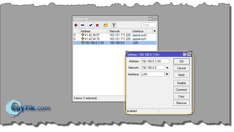الان قم باضافه كارت الخروج من قائمة IP >> adress وقم بتحديد IP كارت الخروج كما تريد كالتالى ..