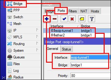 بعد ذلك ، قم بإضافة واجهة EoIP وواجهة Ethernet المتصلة بشبكة LAN المحلية في Bridge Port.