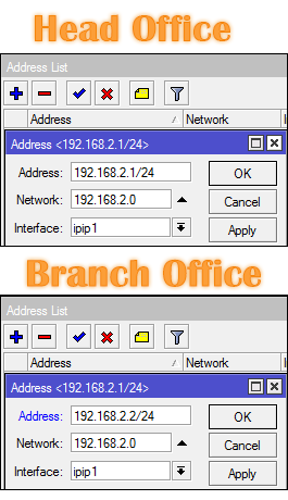 يجب أن يكون عنوان IP المضاف على جانب المكتب الرئيسي والمكتب الفرعي جزءًا واحدًا. في المثال أدناه ، نضيف عنوان IP 192.168.2.1/24 إلى جانب المكتب الرئيسي وعنوان IP 192.168.2.2/24 بجانب المكتب الفرعي.