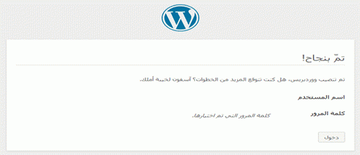 إتمام نجاح عملية تسطيب الوورد بريس العربي، وبإمكانك الآن التوجه إلى مدونتك من خلال النقر على “دخول”.
