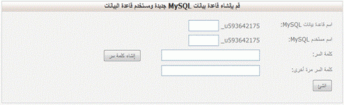 11- ستظهر لك صفحة بها حقول قم بإدخال اسم قاعدة البيانات واسم المستخدم لقاعدة البيانات، ثم أدخل كلمة السر (الباسوورد)، ثم اضغط ” أنشئ “، كما هو مدون بالصورة التالية: