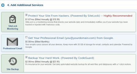 مثل خدمة Site Lock لحماية الموقع من الهجمات أو البريد الاحترافي او الباك اب للموقع وكل خدمة سعرها تجده بجانبها بمجرد اختيارة يتم اضافة المبلغ مباشرة الى فاتورتك