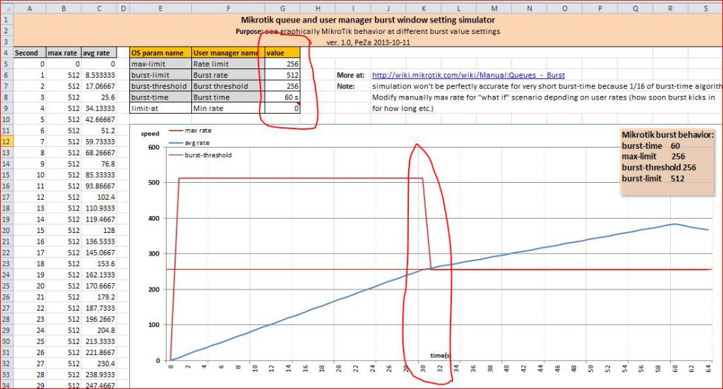 لحساب الاندفاع وربط القيم بشكل صحيح ،  “MikroTik burst simulator.xlsx” بالضغط هنا ، وجربها بنفسك … سوف تحصل على صورة واضحة