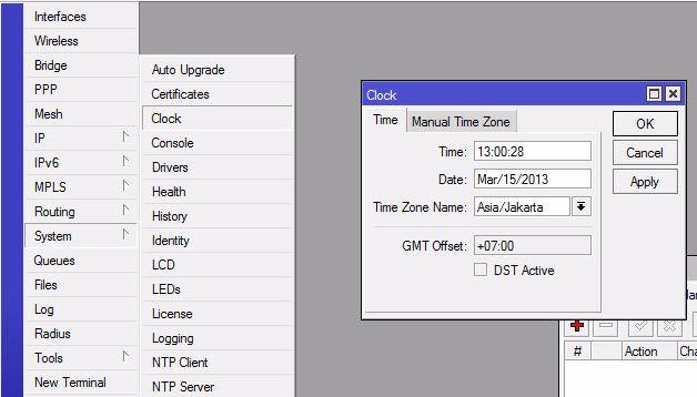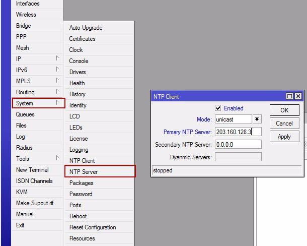حسنا ، لتفادي لتفادي الاعداد غير الدقيق هذه المرة ، تحتاج إلى اعداد بروتوكول وقت الشبكة Mikrotik (NTP). تحتاج أجهزة التوجيه Mikrotik إلى معرفة خادم NTP على الإنترنت وستحاول ضبط تكوين الوقت في خادم NTP. لمزامنة الوقت على تكوين Router Mikrotik ، حيث مثلا يمكنك استخدام خادم NTP لإندونيسيا بعنوان IP 203.160.128.3.